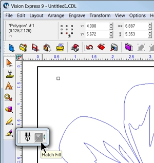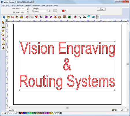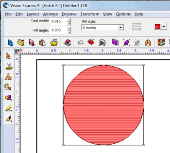 When an outline of an object needs to have the interior, or sections of the interior engraved, the Hatch Fill tool is used. For example, if a simple circle is drawn in the Vision Express 9 software, but you wish to engrave the entire circle, not just the outline a hatch fill is used to create a vector fill path for the engraver to follow.