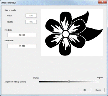 - The next screen has only one adjustment – Alignment Bitmap Density. There is a slider to darken or lighten the image to show more or less detail. Select OK and the bitmap will be automatically converted to a vector outline for engraving.